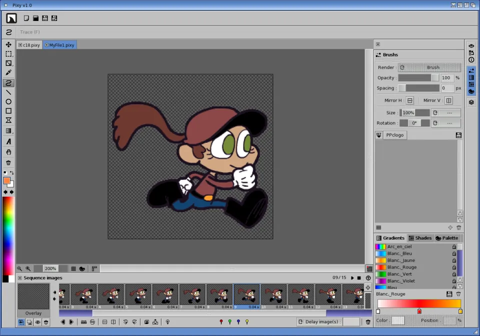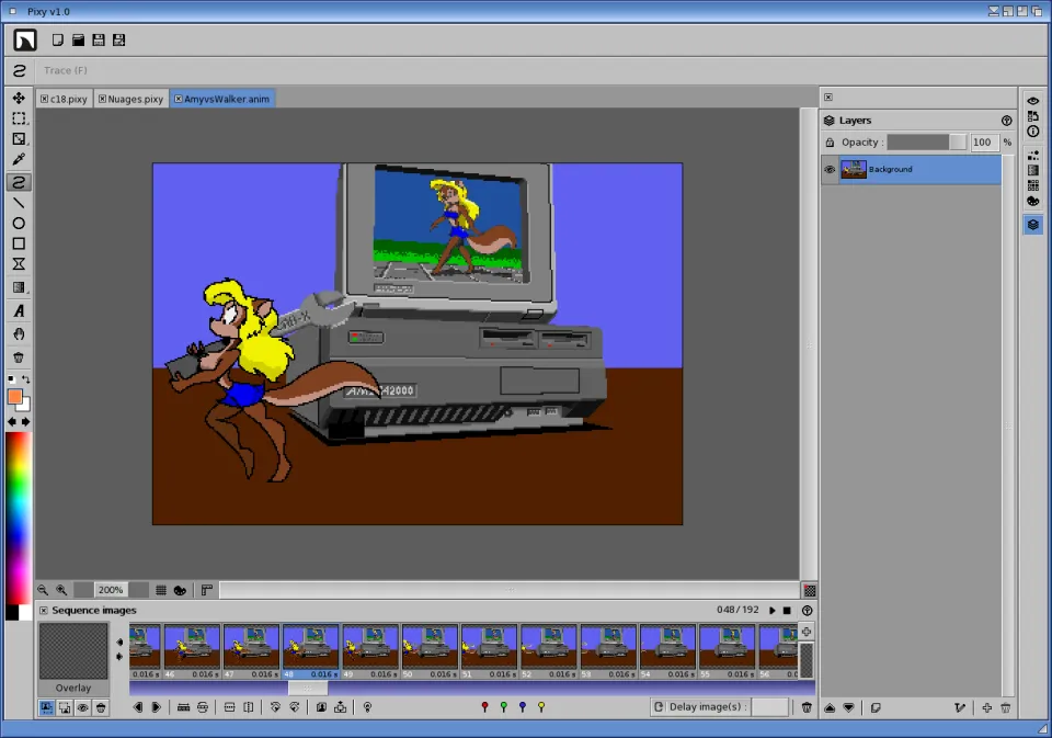 Pixy allows you to create several animations in a single project, each image of each animation sequence contains its own layers. This makes it possible to work on all the animations of a character when creating video games for example.