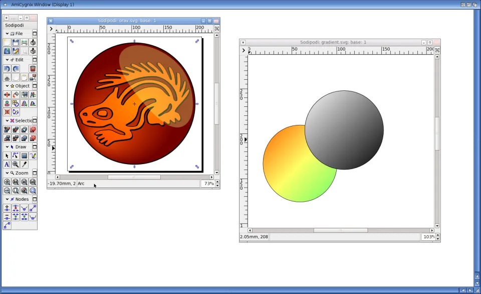 * Gradients (linear and radial). * Grouping of objects * Printer support. * Can export project into a PNG file. Additionally can export project to * Import of graphics in the formats JPeg, PNG, GIF, BMP, TIFF, XPM and SVG. * XML editor to edit the SVG data directly. * Intuitive GUI * High performance * and much more... Requires Amicygnix Developer