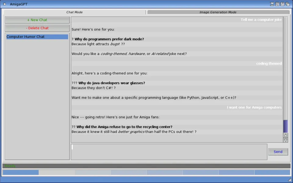 AmigaGPT is a versatile ChatGPT client for AmigaOS 3.x, 4.1 and MorphOS. This powerful tool brings the capabilities of OpenAI's GPT to your Amiga system, enabling text generation, question answering, and creative exploration. AmigaGPT can also generate stunning images using DALL-E and includes support for speech output, making it easier than ever to interact with AI on your Amiga. Designed to integrate seamlessly with your system, AmigaGPT delivers modern AI technology while embracing the timeless Amiga experience. Features: