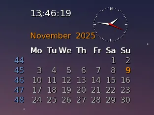 LimpidClock is a transparent clock and calendar. It shows the current time, an analog clock and a calendar of the current month with today highlighted. Developer