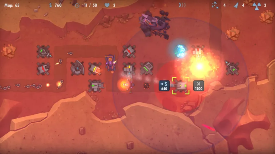 Starfall Defenders is a classic tower defense game that features unique towers and enemies. It also has an in-game shop system that allows players to purchase better towers, upgrade existing ones, and buy special items like the Atom Bomb, Splash Bomb, and Air Supply. Players can earn coins for the shop by defeating boss enemies, saving lives, and unlocking new maps. But Starfall Defenders offers more than just placing, upgrading, and selling towers. Players can also improve their gameplay by placing mines, blocking walls and electric fields directly on the path, and taking control of a tower's direction and target. This player-controlled action is a unique feature within a defense game that allows players to directly hit their enemies. Features